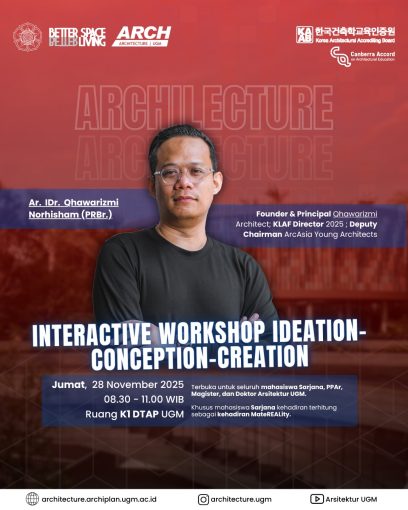 Jumat, 28 November 2025 – Sebagai upaya meningkatkan wawasan mahasiswa di bidang arsitektur praktis, Program Studi Sarjana Arsitektur Universitas Gadjah Mada kembali menyelenggarakan kuliah tamu Archilecture bertajuk “Interactive Workshop: Ideation-Conception-Creation”. Acara ini menghadirkan arsitek asal Malaysia, Ar. IDr. Qhawarizmi Norhisham (PRBr.), yang merupakan Founder dan Principal Architect Qhawarizmi Architect sekaligus Deputy Chairman Arcasia Committee on Young Architects (ACYA).