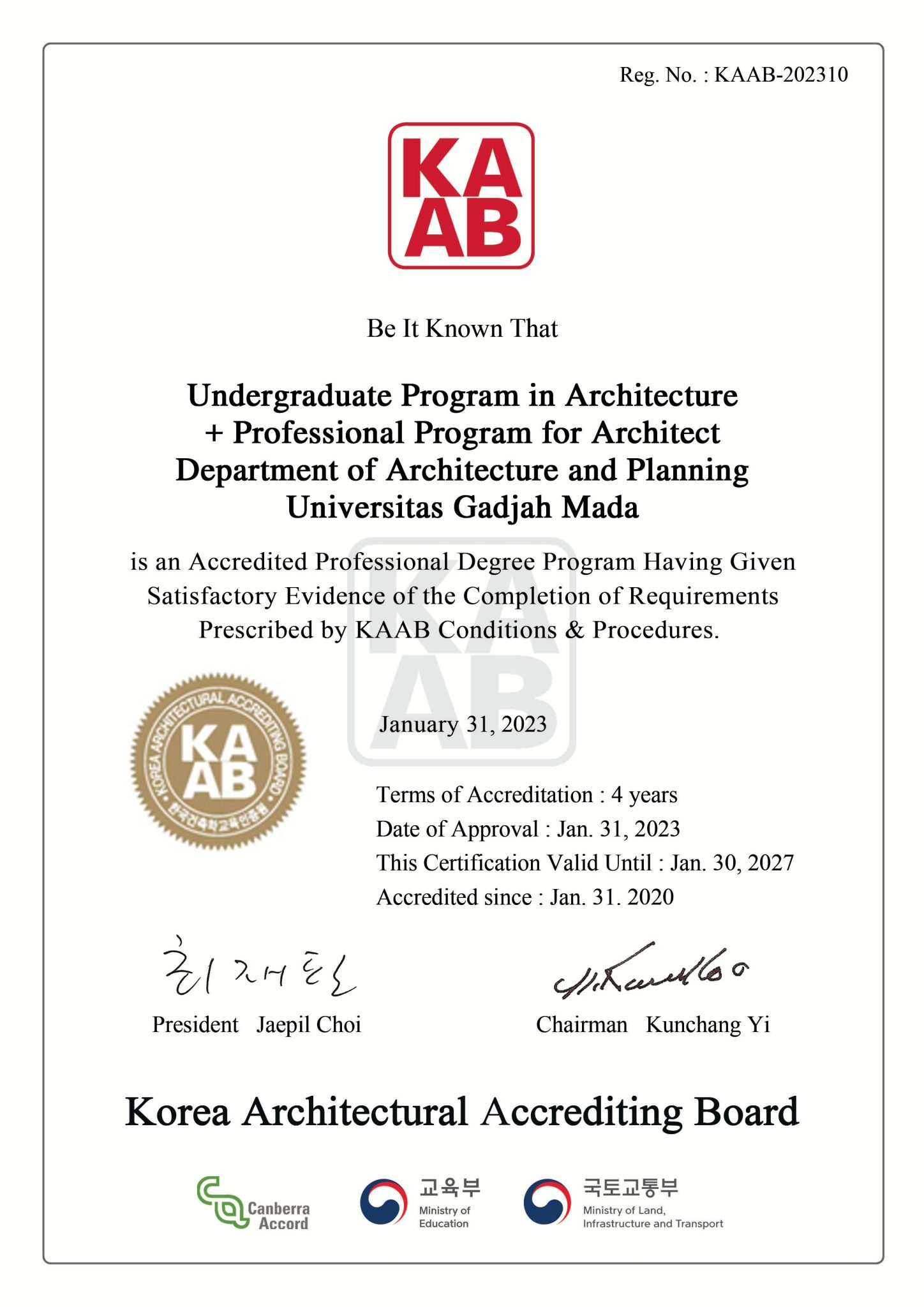 KAAB 25 Februari 2026, 12.10 Oleh: rafaferdinansyahsupriyadi 0 Program Pendidikan Profesi Arsitek telah terakreditasi secara internasional oleh KAAB (Korea Architectural Accrediting Board). https://eng.kaab.or.kr/